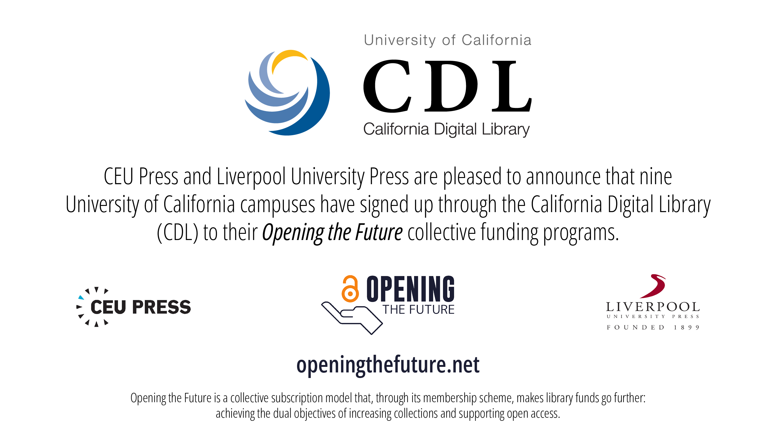 CEU Press and Liverpool University Press are pleased to announce that nine University of California (UC) campuses have signed up through the California Digital Library (CDL) to their Opening the Future collective funding programs. Under the terms of the deal, nine University of California campuses will receive unlimited, perpetual access to curated selections of the two publishers’ backlists: the [...]